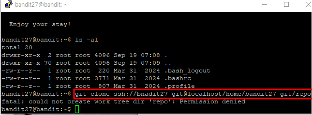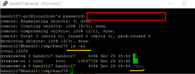 [2] bandit27@bandit:~$ git clone ssh://bandit27-git@localhost/home/bandit27-git/repo