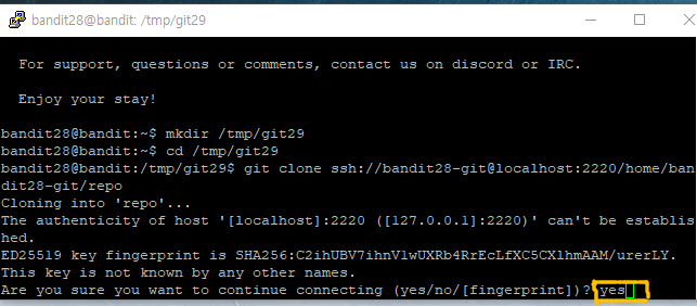 [2] bandit29@bandit/tmp/band30$ git clone ssh://bandit29-git@lcoalhost:2220/hom/bandit29-git /repo