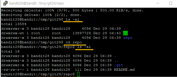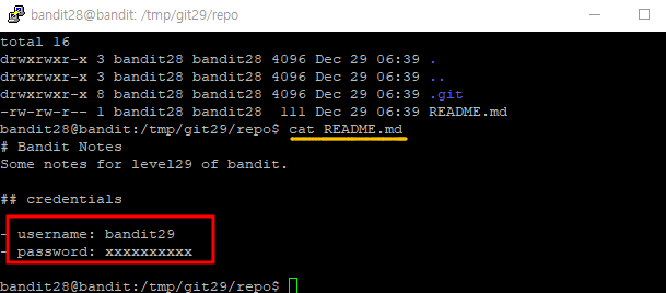 [6] bandit28@bandit:/tmp/git29$ ls -al