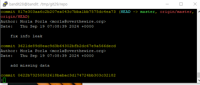 [10] bandit28@bandit:/tmp/git29 $ git log
