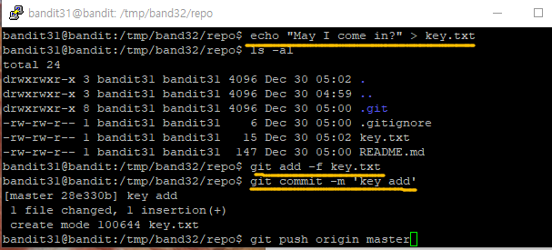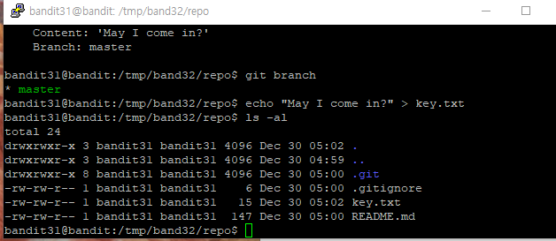 [8] bandit31@bandit:/tmp/band32/repo$ echo "May I come in" > key.txt