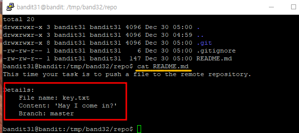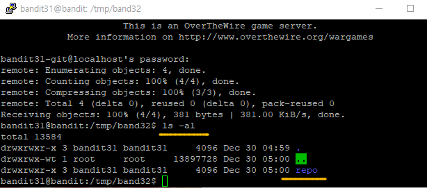 [5] bandit31@bandit:/tmp/band32$ cd repo