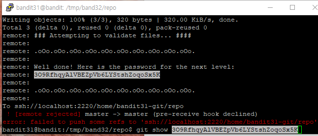 [12] bandit31@bandit:/tmp/band32/repo$ git push origin master
